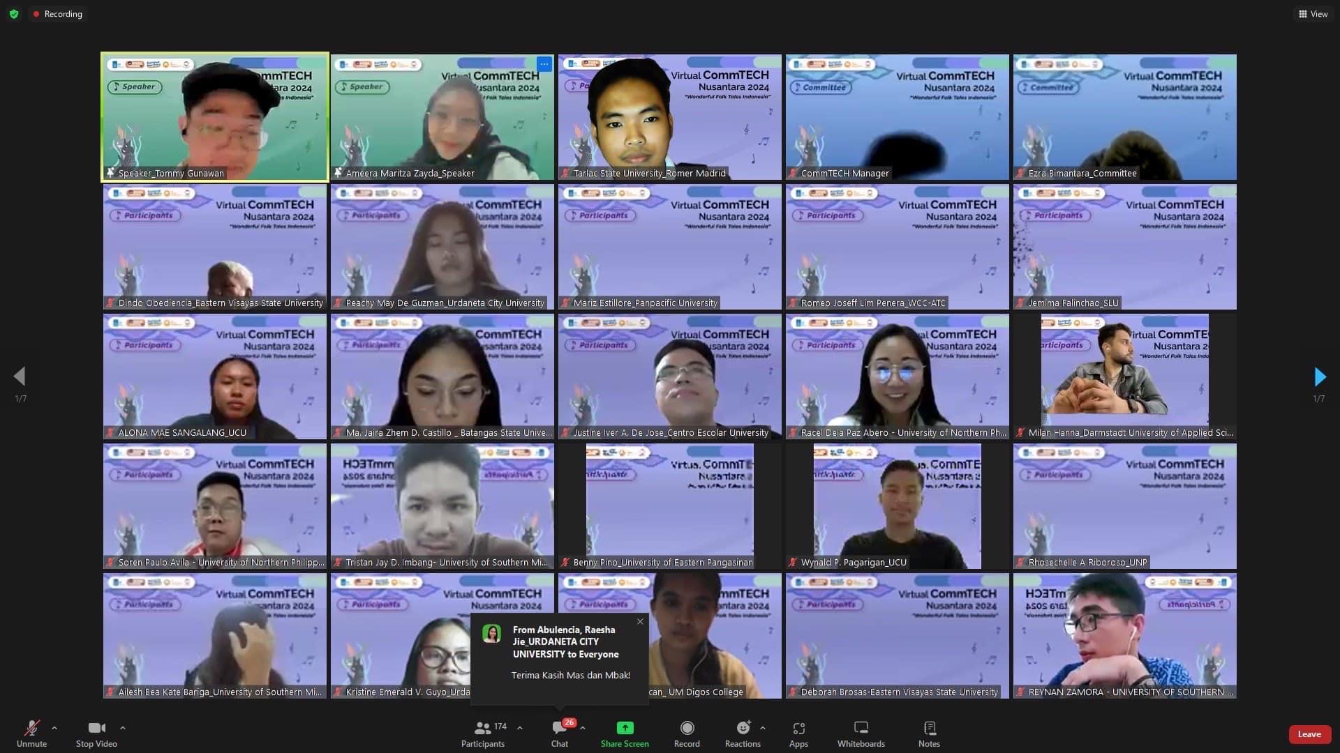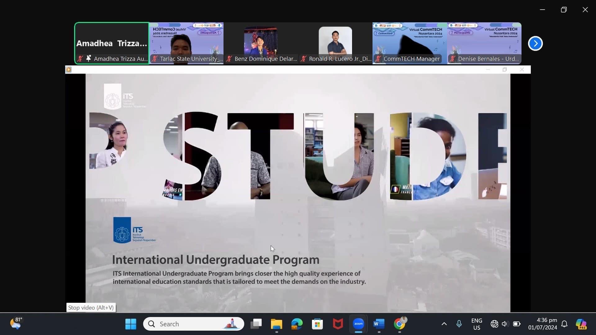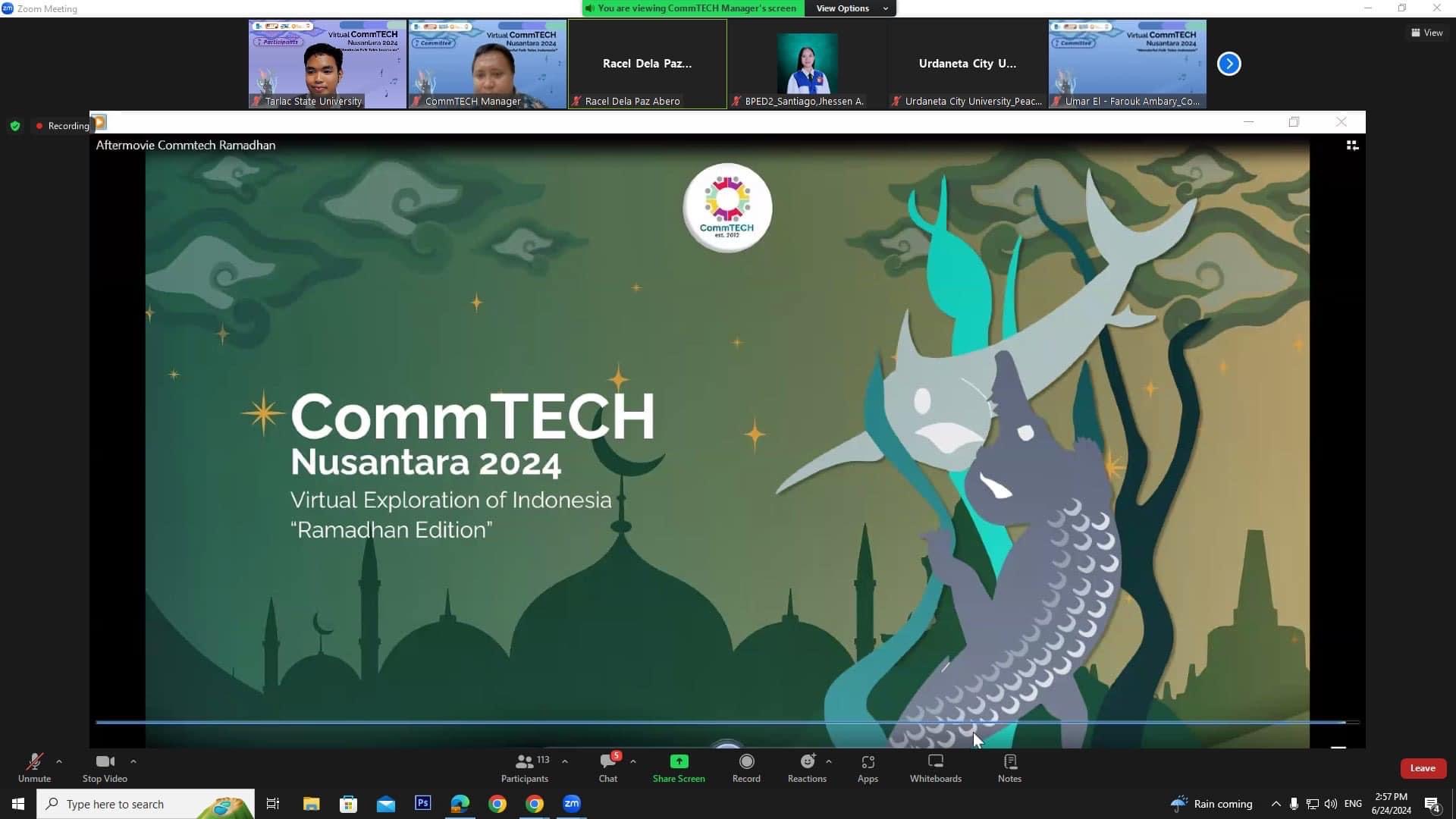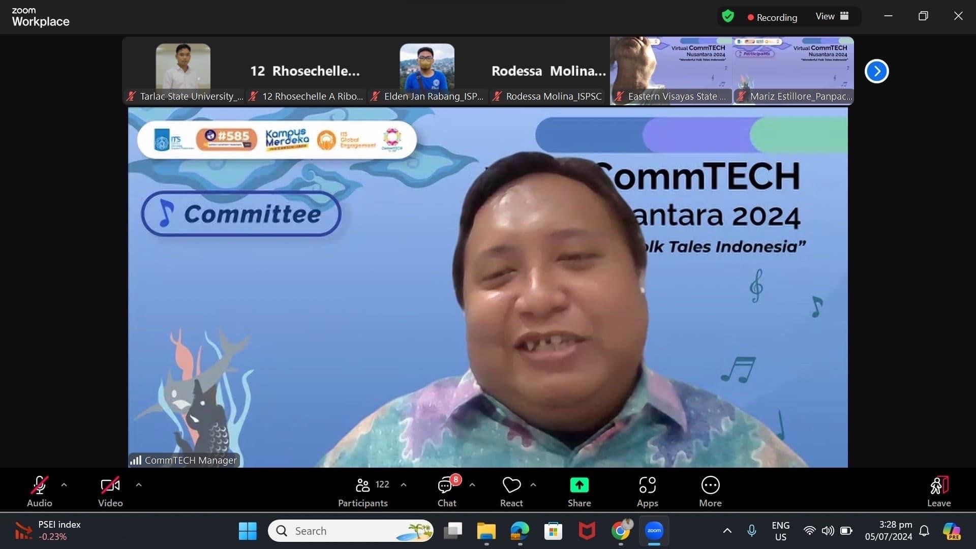 TSU delegates, Mr. Romer Madrid and Asst. Prof. Maria Fermina Joyce C. Nucum, a student and faculty member from the Department of Communication under the College of Arts and Social Sciences, participated in the recently concluded 34th edition of Virtual COMMTech Nusantara 2024: Wonderful Folk Tales Indonesia, held via Zoom from June 24 to July 5, 2024. The event highlighted their efforts to strengthen student-teacher academic mobility.